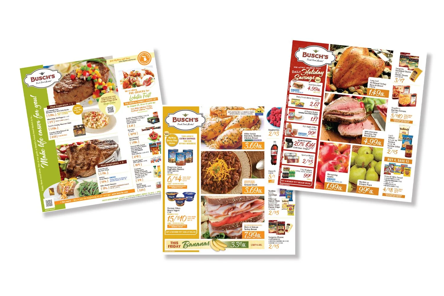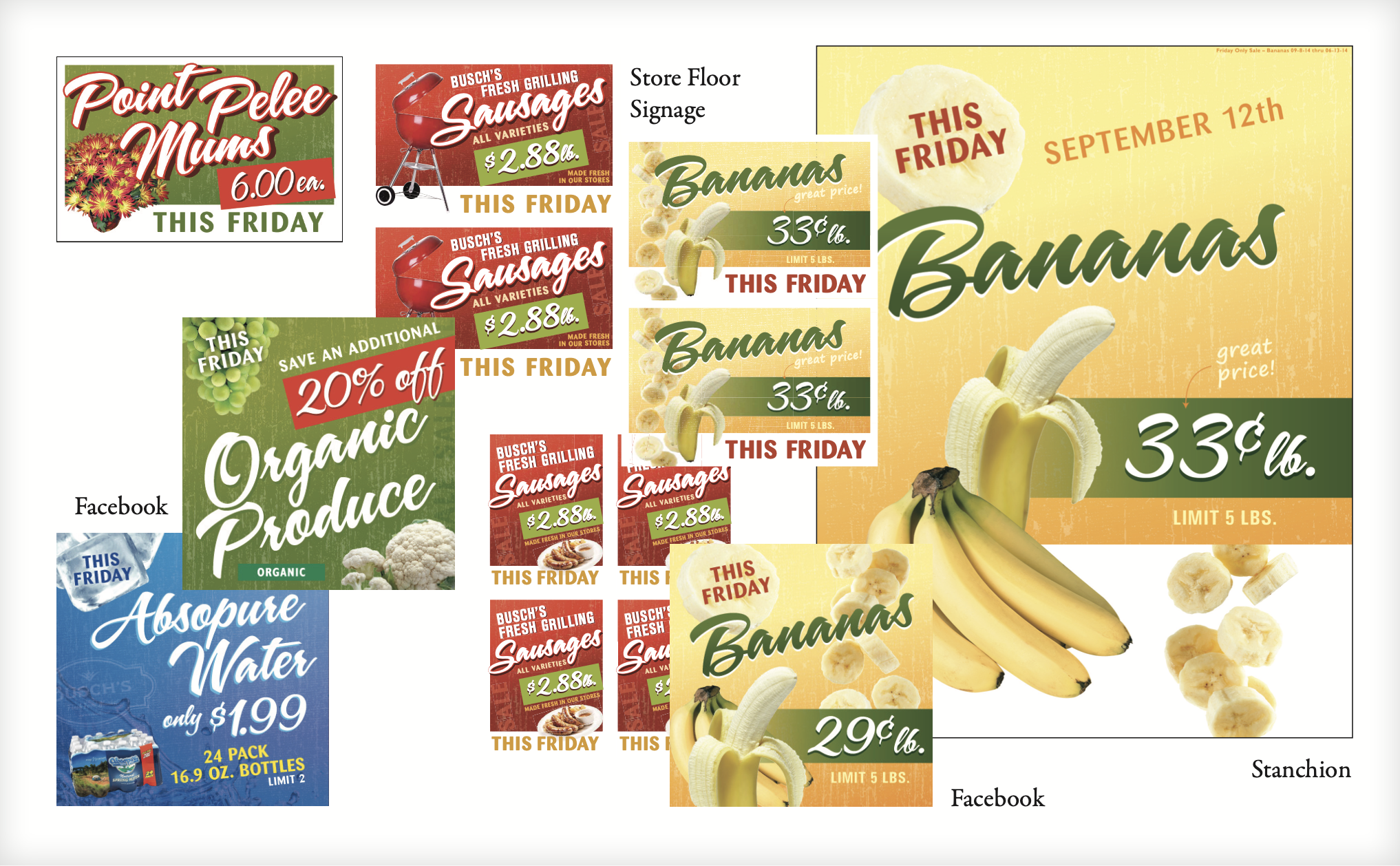 At Busch's Fresh Food Market, I provided graphic design and art direction, focusing on marketing and social media collateral. I enhanced print production management, optimized vendor sourcing, and overhauled both interior and exterior signage, including window clings, product labeling, and in-store signage, improving their placement within the stores. I also created and managed online and print advertising campaigns, developed email marketing content, and composed and shot photography of food and products for advertisements.